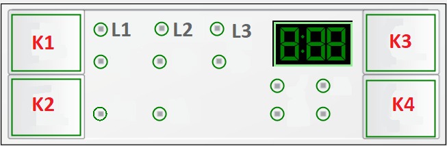 2. Do uživatelského režimu přejdete současným stisknutím a podržením K3 a K4, dokud nezačnou blikat kontrolky L1, L2 a L3 s prázdným displejem.